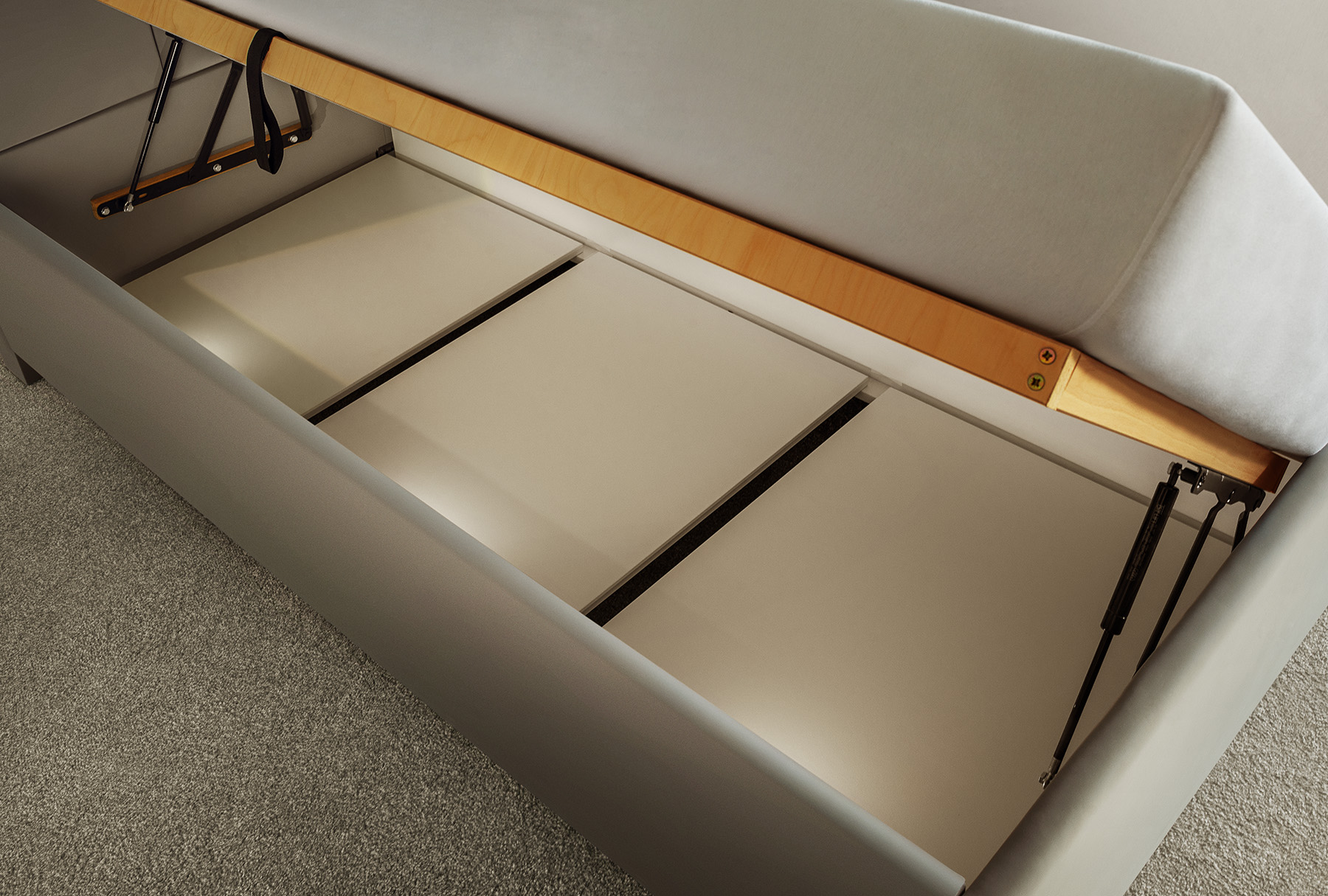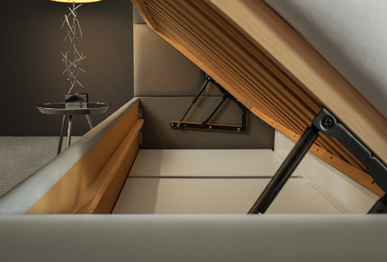 Kladieme dôraz aj na funkciu úložného priestoru. Jeho obsah je až 640 litrov kde nosnosť obsahu zabezpečujú bukové hranoly na ktorých sú položené dosky DTD o hrúbke 18 mm upravené ABS hranou tak aby spĺňali funkciu odvetrávania. Je navrhnutý tak, aby sa pod posteľ dostal každý robotický vysávač. Pri veľkom upratovaní je možné dosky odobrať a umyť podlahu pod posteľou.
