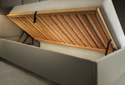 Posteľ je možné zakúpiť s veľkorysým pevným úložným priestorom v objeme 620l. Rám postele s úložným priestorom je nad zemou vždy min. 10 cm. Je to navrhnuté tak, aby pod každou našou posteľou mohol vysávať robotický vysávač.